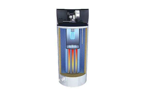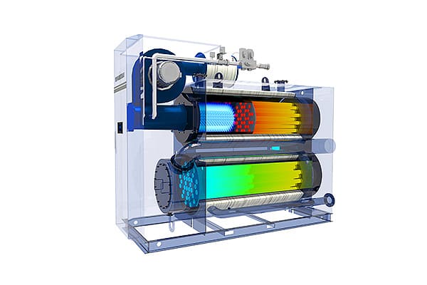 方快容積式熱水鍋爐系列設計為燃燒器下置式煙火管容積式結構,燃料經(jīng)燃燒器霧化后在爐膽內(nèi)微正壓燃燒,高溫煙氣在爐膽內(nèi)進行輻射換熱后進入煙火管對流換熱后經(jīng)下煙室排出。通過采用計算機輔助設計,優(yōu)化各個受熱面,爐體結構設計更加合理。 鍋爐無需冷凝器,爐體內(nèi)部即可實現(xiàn)冷凝,排煙溫度可低至50℃以下,熱效率可達106.6%以上。