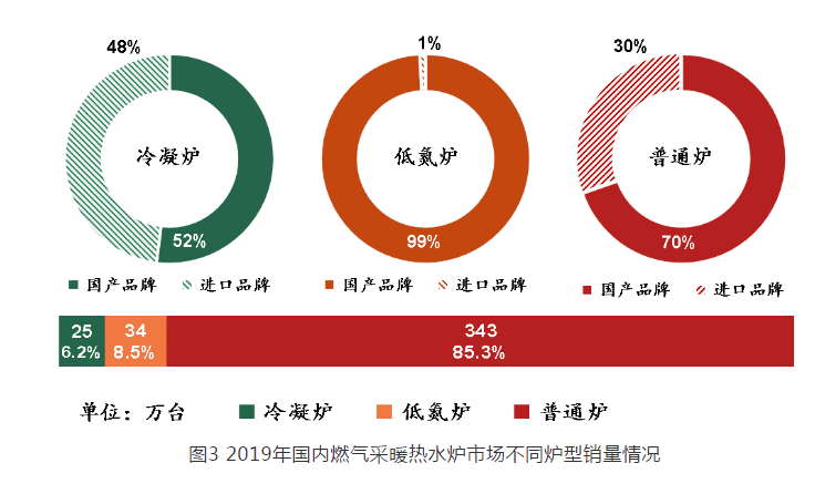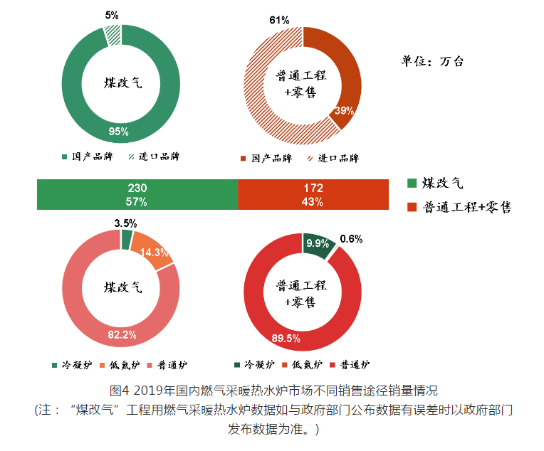 2019 年用于“煤改氣”工程的燃?xì)獠膳療崴疇t銷量為 230 萬臺,占全年總銷量的 57% ,相比 2018 年(“煤改氣”工程用銷量 145 萬臺)增幅 58.6% 。其中,冷凝爐銷量為 8 萬臺,占“煤改氣”工程總銷量的 3.5% ;低氮爐銷量為 33 萬臺,占“煤改氣”工程總銷量的 14.3% ;普通爐銷量為 189 萬臺,占“煤改氣”工程總銷量的 82.2% 。國產(chǎn)品牌銷量為 219 萬臺,占“煤改氣”工程總銷量的 95% ;進(jìn)口品牌銷量為 11 萬臺,占“煤改氣”工程總銷量的 5% 。