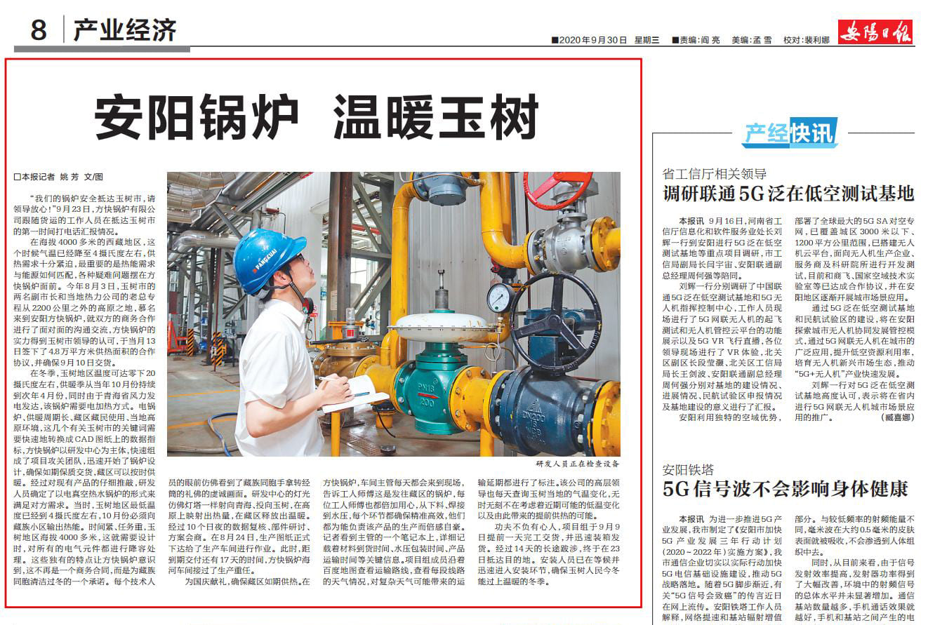 近日,安陽日報就方快鍋爐進(jìn)駐藏區(qū)—青海玉樹供暖項目做了專題報道:《安陽鍋爐,溫暖玉樹》。