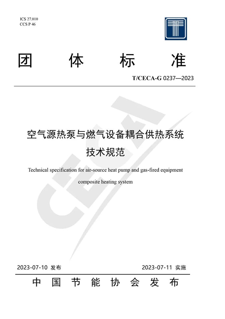 由方快鍋爐有限公司主要參與起草的團體標(biāo)準(zhǔn)T/CECA-G 0237—2023《空氣源熱泵與燃?xì)庠O(shè)備耦合供熱系統(tǒng)技術(shù)規(guī)范》,按照GB/T1.1-2020《標(biāo)準(zhǔn)化工作導(dǎo)則 第一部分:標(biāo)準(zhǔn)化文件的結(jié)構(gòu)和起草規(guī)則》的規(guī)定起草,于2023年07月10日發(fā)布,自2023年7月11日實施。