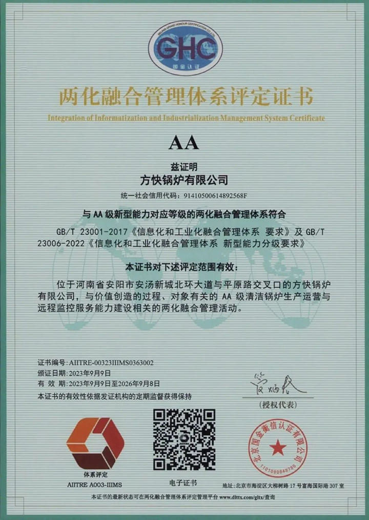 近日,方快鍋爐有限公司順利通過《信息化和工業(yè)化融合管理體系要求》(GB/T 23001-2017)和《信息化和工業(yè)化融合管理體系新型能力分級(jí)要求》(GB/T 23006-2022)認(rèn)證,并獲得兩化融合管理體系A(chǔ)A級(jí)評(píng)定證書。這無疑是對(duì)方快堅(jiān)持“智”造業(yè)突破的認(rèn)可,也充分表達(dá)出方快對(duì)持續(xù)推進(jìn)數(shù)字化經(jīng)營(yíng)管理的決心。